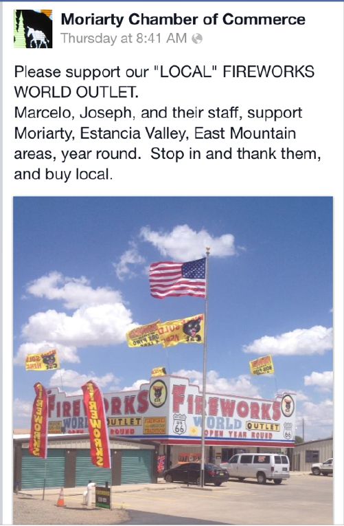 All Roads lead to Fireworks World OutletExit 194 Interstate 40Moriarty New MexicoEasy Off Easy OnJUST WEST OF THE TA TRUCK STOP ON RT66OPEN EVERYDAY8AM-9PM7 DAYS A WEEK